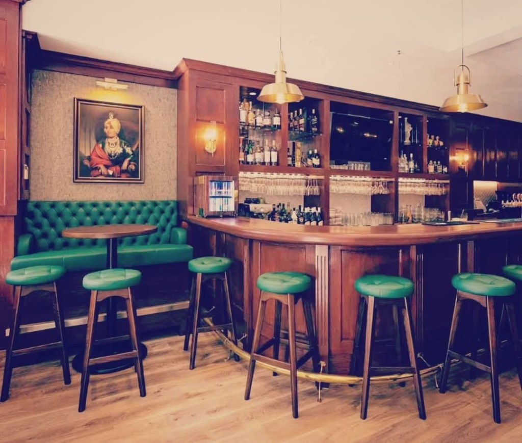 I noticed an incredible black book perched at the end of the bar. I walked over to it and sat down, pondering its construction. So nicely made, I thought, such an attractive artefact. Black leather with gold leaf pages. What is this book? I demanded loudly, to the surprise of the bartender. At first he was taken aback, then suddenly very pleased at his opportunity to educate me. He pointed to a portrait on the wall, depicting a prince in regal attire -full ceremonial regalia- wearing a red cape and a turban with a feather in it, black gems dangling on long earrings, an oval brooch showing Queen Victoria, along with numerous other necklaces and jewels and rings. That is our mascot, our namesake, our forefather and inspiration, Duleep Singh, The Black Prince, Maharaja of the Sikh Empire, King of Punjab, Maharaja of Lahore, all those titles, a personage of great honour and esteem. This book is an account of his audacious and dignified life. Let me convey some of the history…