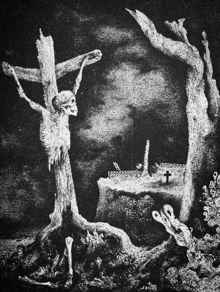 Black — the landscape desolate in shadows,