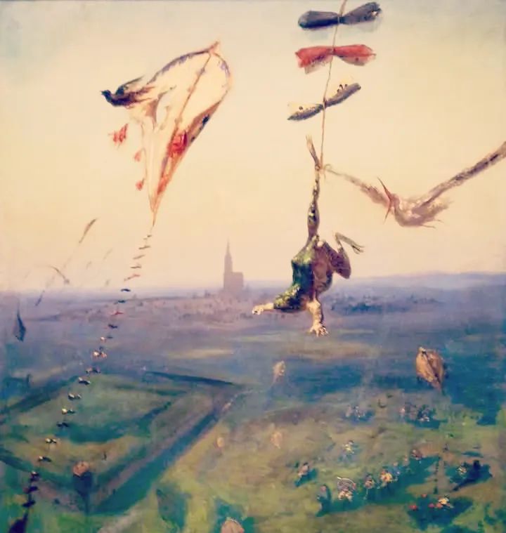 A frog in the aether held up by his leg,